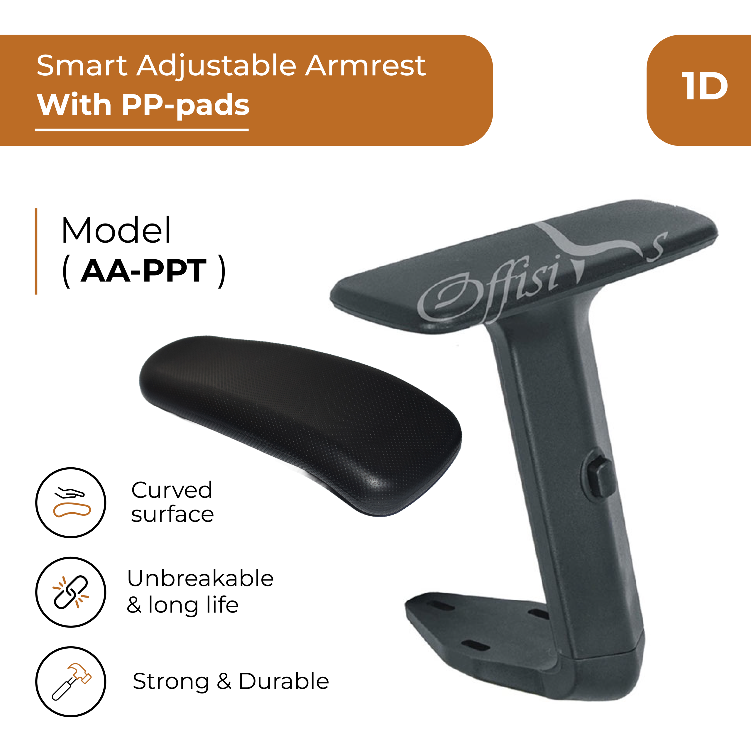 Upgrade your chair with the Smart Adjustable Armrest Model AA-PPT, engineered for strength and ergonomic comfort. Its curved surface and PP pads provide excellent arm support, while the durable, unbreakable material ensures long-lasting performance. Perfect for office, task, and ergonomic chairs, this armrest combines reliability and sleek design to improve your overall seating experience.